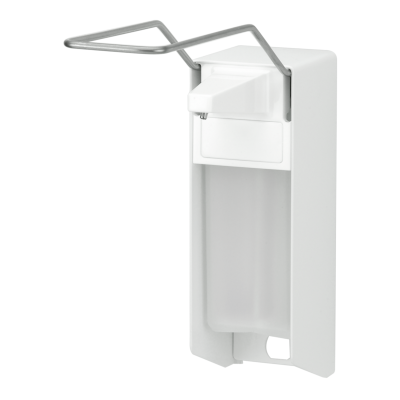 ingo-man® ELSX 26 P/24 Spender für Flüssigseifen und Desinfektionsmittel, für 500 ml Standard-Euroflaschen, extra langer Bedienhebel, Aluminium, weiß pulverbeschichtet (RAL 9010), austauschbare 24er Edelstahlpumpe mit gekröpftem Saugrohr, einstellbare Dosierung (ca. 0,7/ 1,0/ 1,5 ml/Hub), 1 Clip, inkl. PET-Leerflasche
