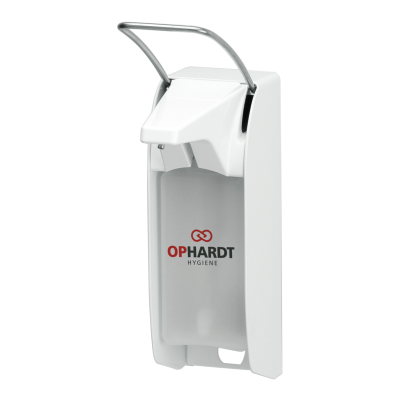 ingo-man® plus IMP E P/24, Spender für Flüssigseifen und Desinfektionsmittel, für 500 ml Standard-Euroflaschen, kurzer Bedienhebel, Aluminium, weiß pulverbeschichtet (RAL9010), austauschbare 24er Edelstahlpumpe mit gekröpftem Saugrohr, einstellbare Dosierung (ca. 0,75/ 1,0/ 1,2/ 1,5 ml/Hub), 1 Clip, inkl. PET-Leerflasche