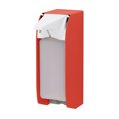 ingo-man® plus IMP T P Touchless XT, berührungsloser Spender für Desinfektionsmittel, Lotionen und Flüssigseifen mit Sensortechnologie, für 1.000 ml Standard-Euroflaschen, Aluminium, leuchtrot pulverbeschichtet, mattsilber, austauschbare und autoklavierbare Edelstahlpumpe, einstellbare Dosierung (ca. 0,75/ 1,0/ 1,2 /1,5 ml/Hub), inkl. PET-Leerflasche und 5 Alkaline D-Batterien, mit versenkbarem Notbedienhebel
