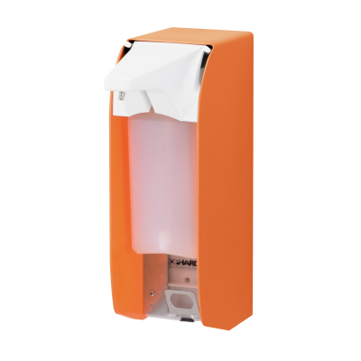 ingo-man® plus IMP E P DHP Touchless XT, berührungsloser Spender für Desinfektionsmittel, Lotionen und Flüssigseifen mit Sensortechnologie, für 500 ml Standard-Euroflaschen, Aluminium, leuchthellorange pulverbeschichtet, DHP Einwegpumpe, Dosierung ca. 1,5 ml/Hub, inkl. 5 Alkaline D-Batterien, mit versenkbarem Notbedienhebel, ohne PET-Leerflasche