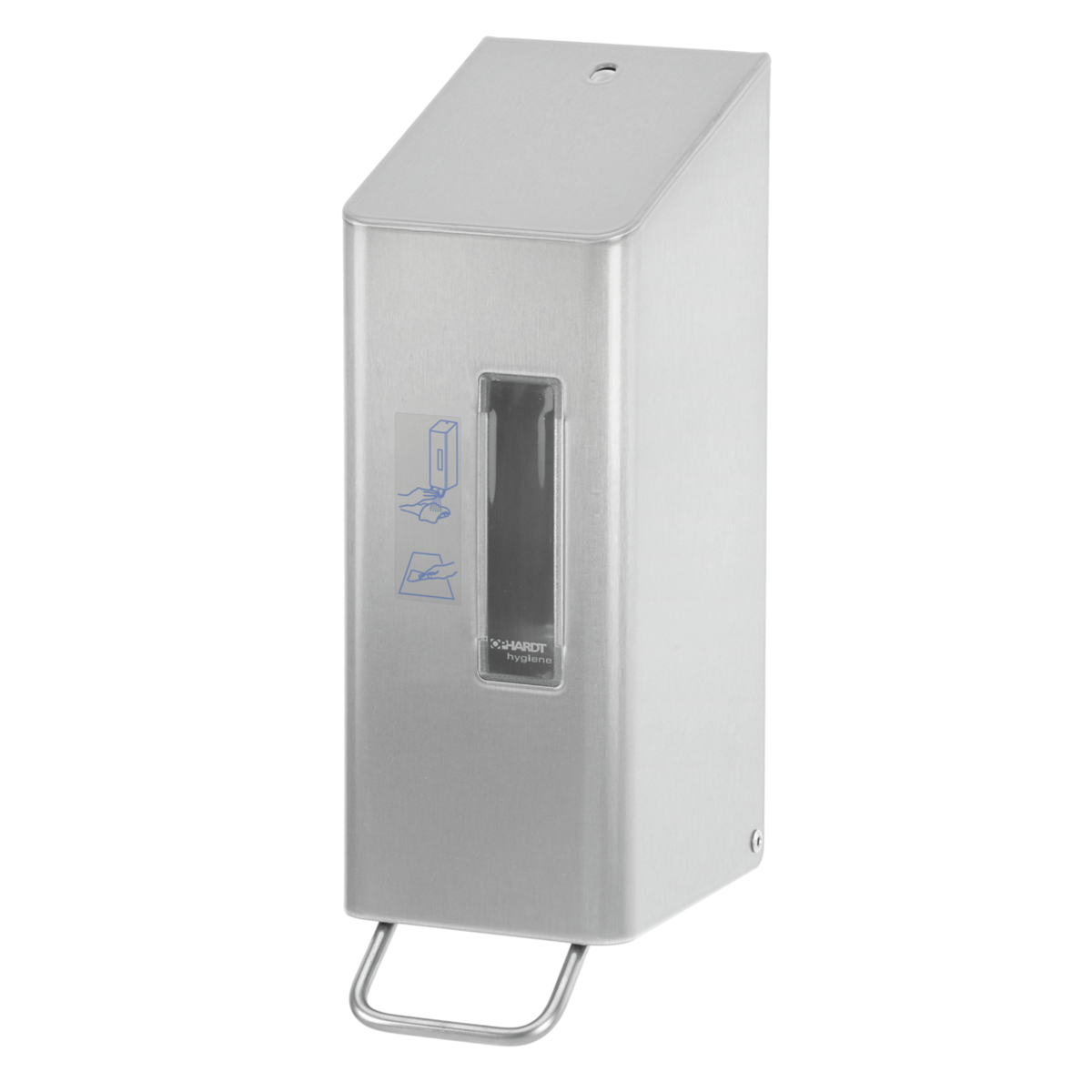 SanTRAL® Classic TSU 5 E/D Steel Touch (ST), spray dispenser for toilet seat disinfection, 600 ml, brushed stainless steel, with anti-fingerprint-coating, refillable container with plastic pump, dosage of approx. 0.7 ml/stroke, lockable, with fill level window and labelled with usage instructions