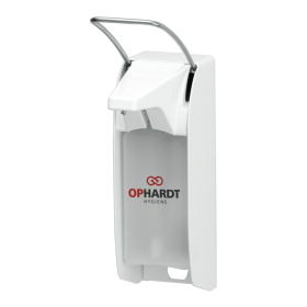 ingo-man® plus IMP E P/24, soap and disinfectant dispenser, for 500 ml standard Euro bottles, short operating lever, aluminium, white powder coated (RAL 9010), exchangeable stainless steel pump 24 with bent suction tube, different dosage adjustments (approx. 0.75/ 1.0/ 1.2/ 1.5 ml/stroke), 1 clip, PET Euro bottle incl.