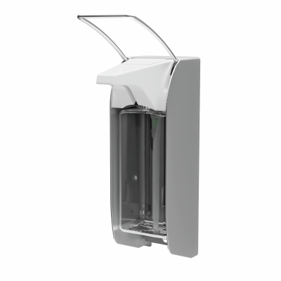 ingo-man® plus IMP T A/K, dispenser for liquid soaps, disinfectants and sun protection creams (up to SPF 50), for 1000 ml standard Euro bottles, short operating lever, matte-silver anodized aluminium, exchangeable plastic pump with straight suction tube, different dosage adjustments (approx. 0.7/ 1.0/ 1.5 ml/stroke), 1 clip, PET Euro bottle incl.