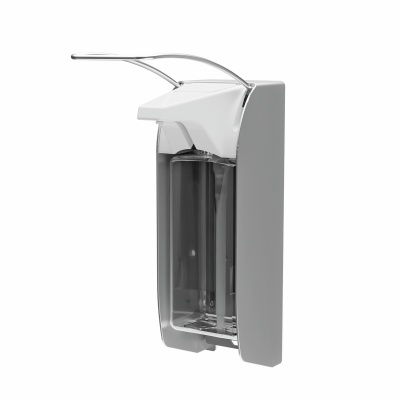 ingo-man® plus IMP TLS A/KSP, disinfectant dispenser, for 1000 ml standard Euro bottles, long operating lever, matte-silver anodized aluminium, exchangeable plastic spray pump with straight suction tube, dosage approx. 1.0 ml/stroke, 1 clip, PET Euro bottle incl.