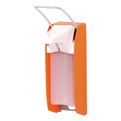 ingo-man® plus IMP E P/24, soap and disinfectant dispenser, for 500 ml standard Euro bottles, short operating lever, aluminium, hi-vis orange powder coated, exchangeable stainless steel pump 24 with bent suction tube, different dosage adjustments (approx. 0.75/ 1.0/ 1.2/ 1.5 ml/stroke), 1 clip, PET Euro bottle incl.