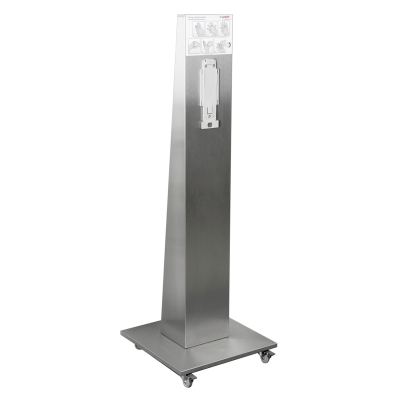 ingo-man® disinfection point, brushed stainless steel, with anti-fingerprint-coating, completely pre-mounted with wheels, ready for installation of ingo-man dispensers, incl. pictogram for hand disinfection