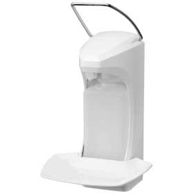 RX 5 M manual dispenser for disinfectant, alco-gel, soap and flowable lotions, for wall mounting, for 500 ml standard Euro bottles, white plastic housing, stainless steel lever, with replaceable plastic pump, 1.5 ml/stroke, incl. empty PET Euro bottle, non-lockable dispenser, with white drip tray
