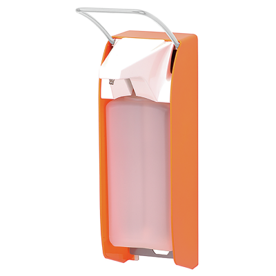 ingo-man® plus IMP T P/DHP, soap and disinfectant dispenser, for 1000 ml standard Euro bottles, short operating lever, hi-vis orange powder coated, incl. DHP disposable hygiene pump, dosage approx. 1.5 ml/stroke, 1 clip, bottle not included