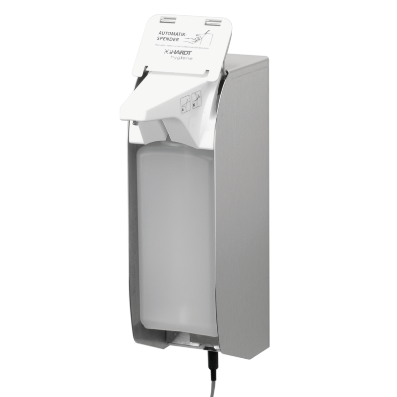 ingo-man® plus IMP T E DHP Touchless Mains Operated, dispenser for disinfectant solutions, lotions and liquid soaps with touchless sensor technology, for 1000 ml standard Euro bottles, brushed stainless steel, DHP single use plastic pump, dosage 1.5 ml/stroke, 1 clip "automatic dispenser", with permanent emergency lever, without PET bottle, ready for operation with 220 Volt-transformer, plug at the bottom side
