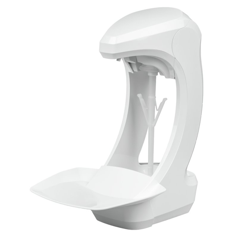 RX 5 T desktop touchless dispenser for disinfectant, alcogel, soaps and flowable lotions, for 500 ml standard Euro bottles (not included), white plastic housing, with disposable hygiene pump, dosage 1.5 ml/stroke, adjustable number of strokes (1-3 strokes), with white drip tray, incl. 4 C cell batteries