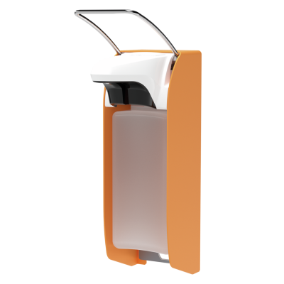 ingo-man® smart IMS T P/24, soap and disinfectant dispenser, for 1000 ml standard Euro bottles, short operating stainless steel lever, hi-vis orange powder coated aluminium housing, exchangeable stainless steel pump 24 with bent suction tube, different dosage adjustments (approx. 0.75/ 1.0/ 1.2/ 1.5 ml/stroke), PET Euro bottle incl., with intelligent face shield that enables WiFi communication with KANARY, the unit automatically records hand hygiene events (dosage, timestamp, dispenser ID) and sends that data to a central database for evaluation, gives immediate feedback on performance through an integrated LED, A separate integrated LED informs users when the battery is low