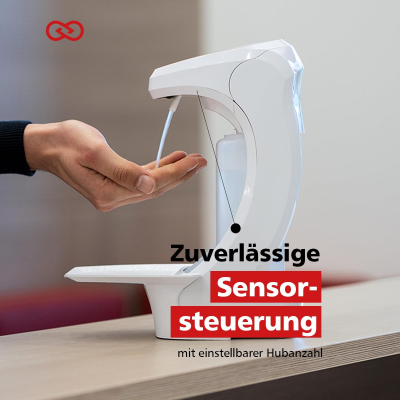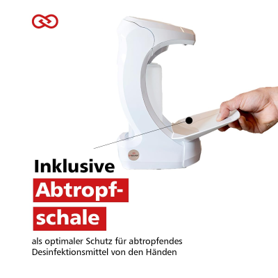 RX 5 T Smart From the Start, desktop touchless dispenser for disinfectant, alcogel, soaps and flowable lotions, for 500 ml standard Euro bottles, white plastic housing, exchangeable plastic pump, dosage 1.5 ml/stroke, adjustable number of strokes (1-3 strokes), with white drip tray, incl. empty PET Euro bottle and 4 C cell batteries