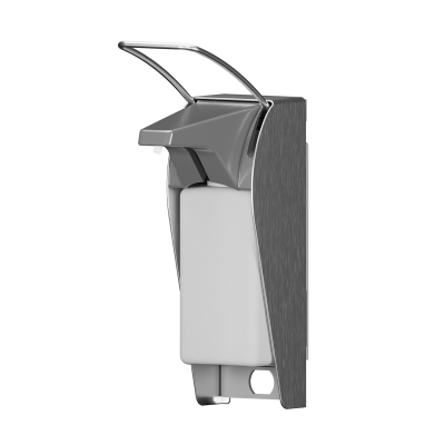 ingo-man® go modular E E/K, dispenser for liquid soaps and hand disinfectants, for 500 ml standard Euro bottles, brushed stainless steel housing, short operating lever, grey PCR plastic face shield (color may differ slightly depending on material), long-life plastic pump with straight suction tube, easy pump replacement through front removal, dosage approx. 1.5 ml/stroke, compatible with all stainless steel pumps in the IMP series, empty bottle not included in the scope of delivery