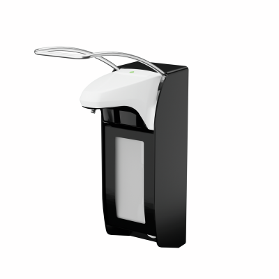 ingo-man® smart IMS ELS P/DHP Xclusive, dispenser for disinfectants, soaps and lotions, for 500 ml standard Euro bottles, long operating stainless steel lever, matte black powder coated (RAL 9005) aluminium housing, incl. DHP single use plastic pump, dosage 1.5 ml/stroke, with intelligent face shield that enables WiFi communication with KANARY, the unit automatically records hand hygiene events (dosage, timestamp, dispenser ID) and sends that data to a central database for evaluation, gives immediate feedback on performance through an integrated LED, A separate integrated LED informs users when the battery is low
