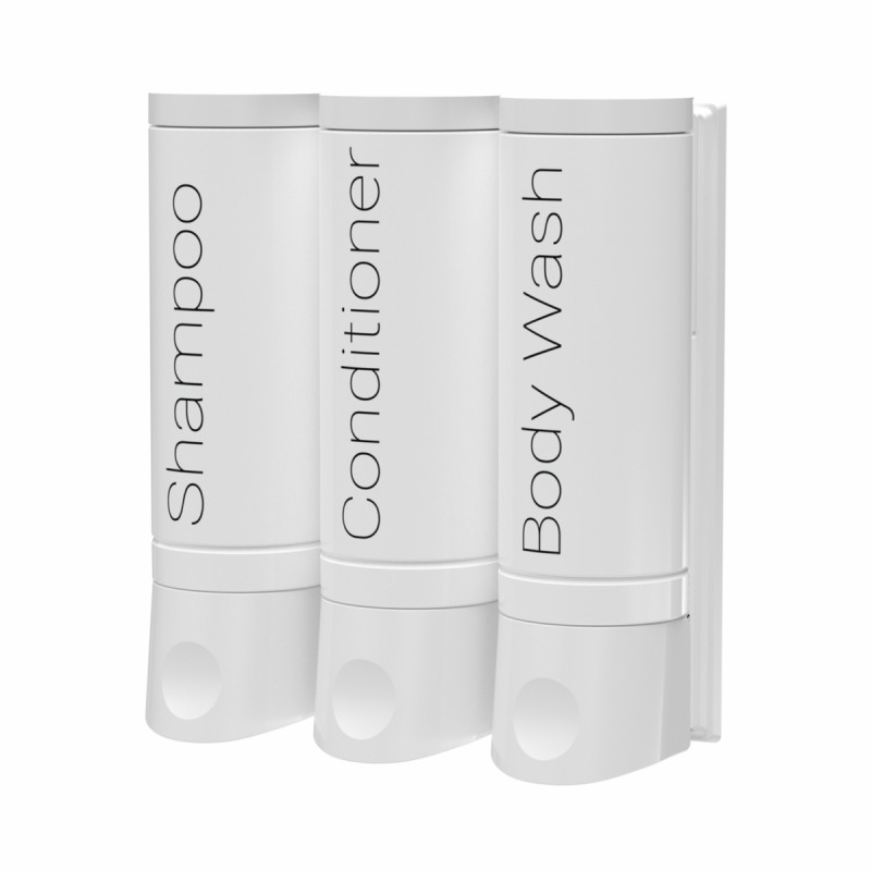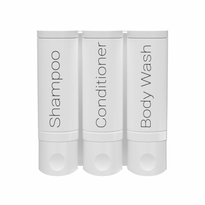 H3 refillable triple dispenser, ABS plastic, white, with 3 semi-permanent dosing pumps (Art. No.: SP38MHV20CV) made of PCR plastic, grey, vented, with CleanTip Technology (No dripping), dosing quantity 2.0 ml/stroke, for various filling products (soap, lotion, gel), with 3 refillable 450 ml PET bottles (Art. No.: H-Bottle), for wall mounting, ideal for washrooms, showers and toilet areas in hotels or anywhere hospitality hygiene is a priority