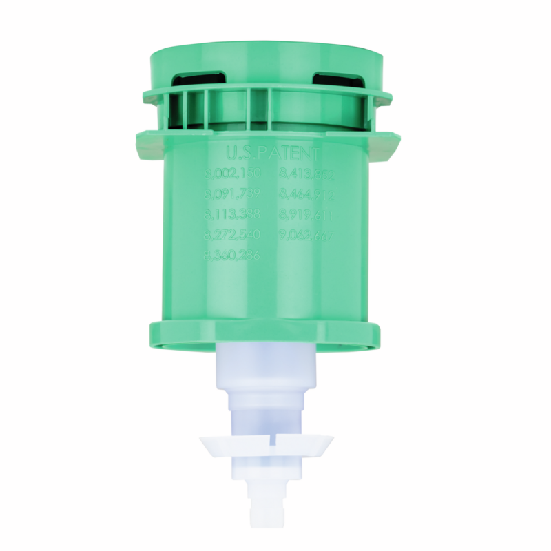 X10 Cartridge pump, for bottles with 45 mm necks, dosing quantity between 0,4 - 1,5 ml/stroke adjustable at the dispenser, green cylinder, transparent cap, compatible with all dispensers where an X10 dosing system is built-in, for dosing of Foam soap, for rigid bottles, vented, with CleanTip technology (no drips or leaks), metal-free pump for improved recyclability
