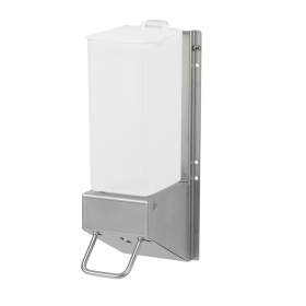 Soap dispenser with operating lever and a window to view filling level, made of stainless steel