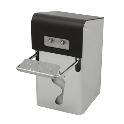 Soap dispenser with operating lever and a window to view filling level, made of stainless steel