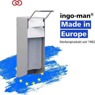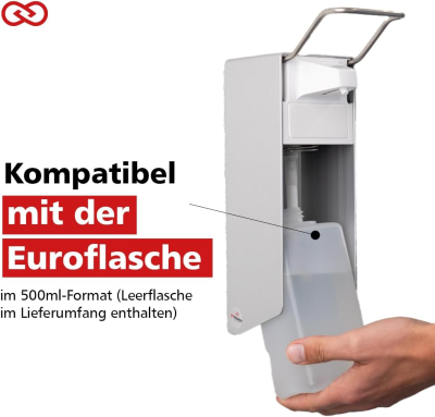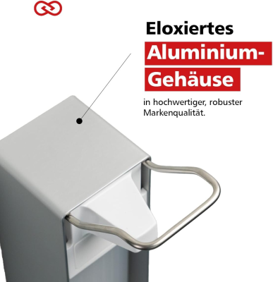 ingo-man® E 26 A/24 Spender für Flüssigseifen und Desinfektionsmittel, für 500 ml Standard-Euroflaschen, kurzer Bedienhebel, eloxiertes Aluminium, mattsilber, austauschbare 24er Edelstahlpumpe mit gekröpftem Saugrohr, einstellbare Dosierung (ca. 0,7/ 1,0/ 1,5 ml/Hub), 1 Clip, inkl. PET-Leerflasche
