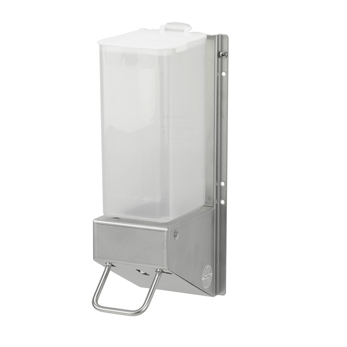 SanTRAL® Classic Bahnspender 2 FR, für Schrankeinbau, kompatibel mit Flüssigseifen, Edelstahl-Behälteraufnahme, Edelstahl-Bedienhebel, 1.200 ml, Pumpe mit Behälter austauschbar, PP-Nachfüllbehälter herausnehmbar, feuerhemmend