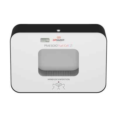 Berührungsloser brennstoffzellenbetriebener Händedesinfektionsmittelspender, für 1.000 ml Standard-Euroflaschen, für Desinfektionsmittel aus mindestens 70% Isopropanol und 30% reinem Wasser (ohne Rückfetter, Duftstoffe oder anderen Zusatzstoffen), Edelstahl, mattschwarz pulverbeschichtet (RAL 9005), Tür pulverbeschichtet weiß (RAL 9016 Verkehrsweiß) mit Zusatzaufdruck "Händedesinfektion", autoklavierbare Edelstahlpumpe mit Duschkopf (keine Bildung von Aerosolen), Dosierung ca. 1,5 ml/Hub, Sprühkammer, integrierte Auffangschale, angetrieben durch Brennstoffzelle, die geringen Anteil des Isopropanols in elektrische Energie umwandelt, inkl. PET-Leerflasche, zur Wandmontage mit 4 Schrauben und Dübeln oder zur Montage auf Standfuß