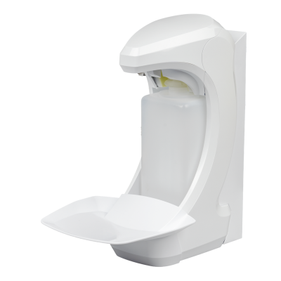 RX 5 T berührungsloser Spender mit Rückwand zur Wandmontage, für Desinfektionsmittel, Alcogel, Seifen und fließfähige Lotionen, für 500 ml Standard-Euroflaschen, weißes Kunststoffgehäuse, austauschbare Kunststoffpumpe, Dosiermenge 1,0 ml/Hub, einstellbare Hubanzahl (1-3 Hübe), mit weißer Abtropfschale, inkl. PET-Leerflasche und 4 C Zellen Batterien