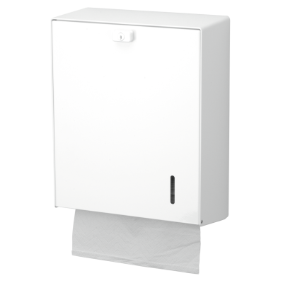 ingo-man® HS 31 P, Papierhandtuchspender mit Kunststoffentnahme, für ca. 500-600 Faltpapierhandtücher mit ZZ- oder Lagenfalz, mit integriertem Einlagebügel für Nutzung von Interfold- und Z-Falz-Papier, Aluminium, weiß pulverbeschichtet (RAL 9010), Metall-Frontklappe mit Sichtschlitz, mit Schloss und Schlüssel