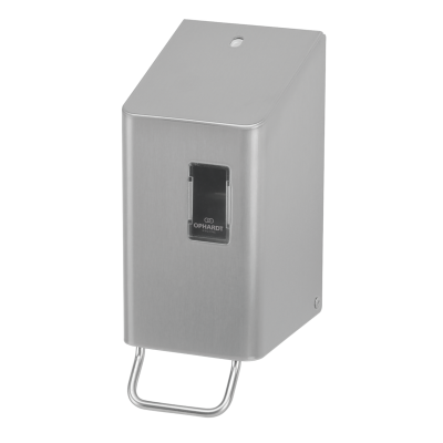 Seifenspender aus Edelstahl mit Bedienhebel und Sichtfenster zur Füllstandskontrolle