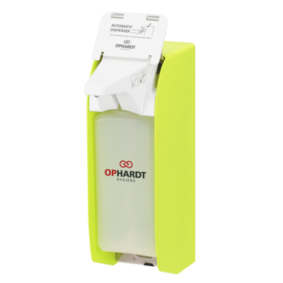 ingo-man® plus IMP T P Touchless, dispenser for disinfectant solutions, lotions and liquid soaps with touchless sensor technology, for 1000 ml standard Euro bottles, aluminium, hi-vis yellow powder coated, exchangeable and autoclavable stainless steel pump, different dosage adjustments (approx. 0.75/ 1.0/ 1.2 /1.5 ml/stroke), 1 clip "automatic dispenser", with permanent emergency lever, incl. PET bottle and 5 alkaline D-batteries