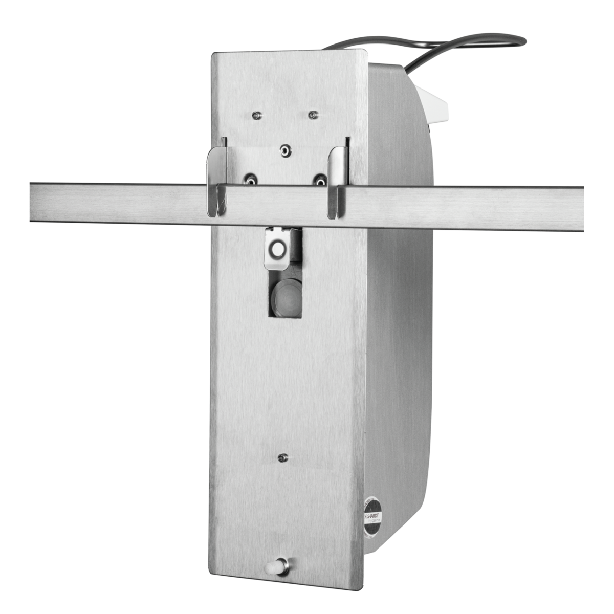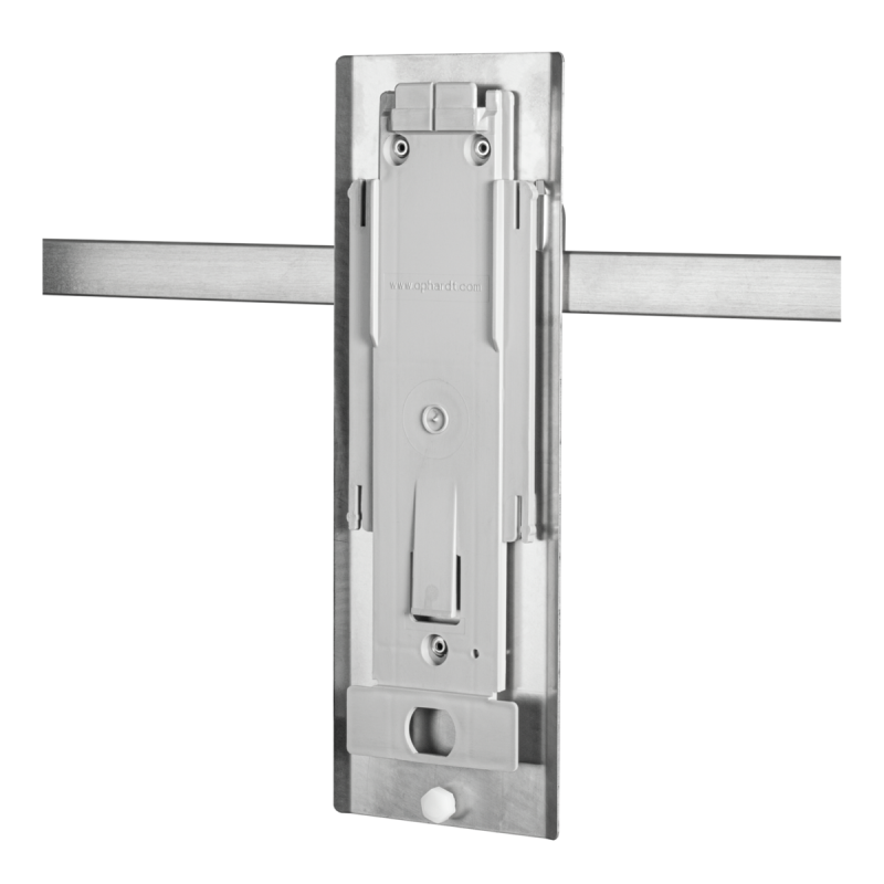ingo-man® WH D3 T 25 adapter plate, polished stainless steel, bracket for 25 x 10 mm standard rail, for 1000 mlingo-man®® dispenser and dispensers from the RX, LCP, and ER T series, for patient-oriented attachment to the standard rail at the point of care