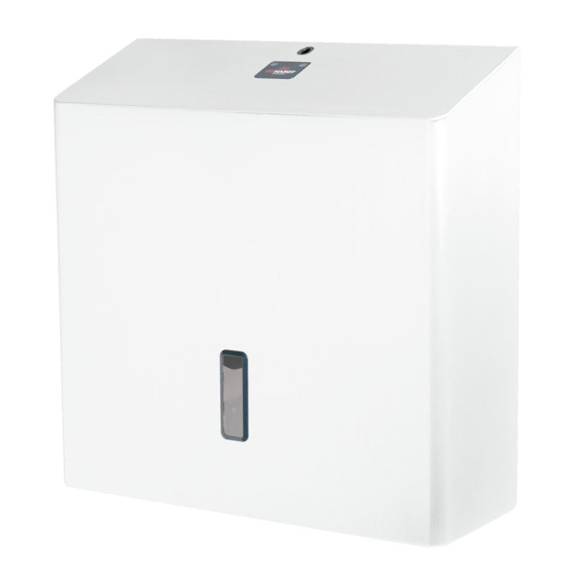 SanTRAL® Plus JRU 1 P Arctic White (AW), jumbo-roll toilet paper dispenser for jumbo-rolls up to 330 mm diameter, stainless steel, white powder coated (RAL 9016 Traffic White), lockable, with fill level window, stainless steel paper withdrawal, roll holder has a brake that prevents the rolls from quickly unwinding and accidentally unrolling large amounts of toilet paper; sloped-top housing prevents placement of unwanted objects on dispenser