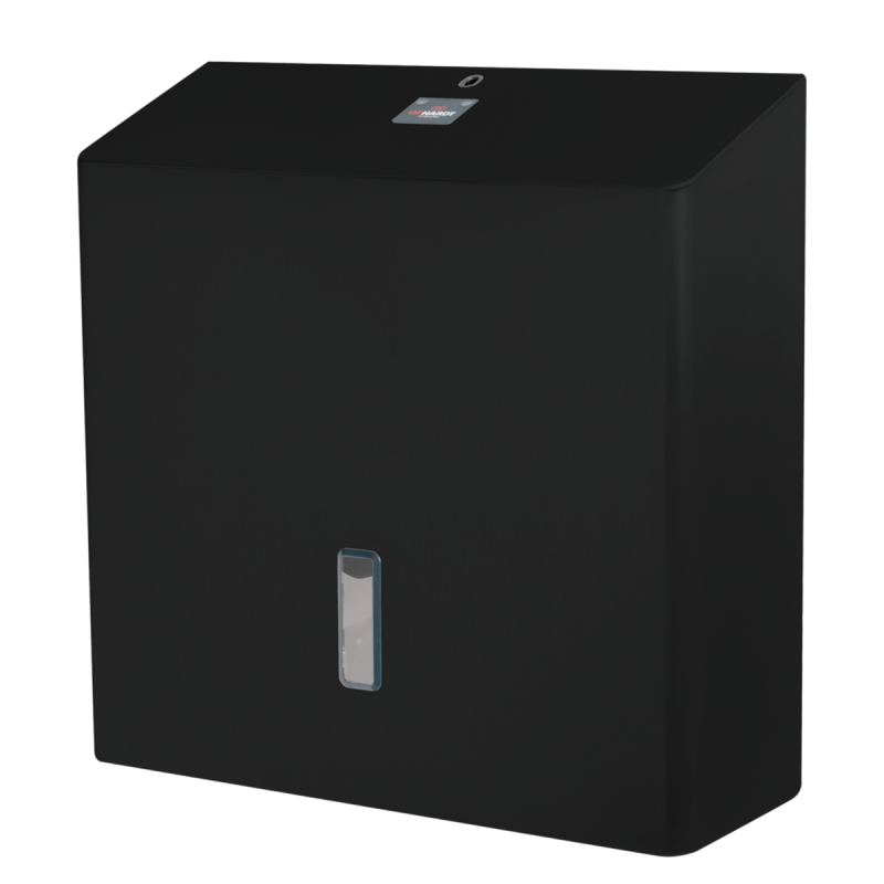 SanTRAL® Plus JRU 1 P Midnight (MN), jumbo-roll toilet paper dispenser for jumbo-rolls up to 330 mm diameter, stainless steel, matte black powder coated (RAL 9005), lockable, with fill level window, stainless steel paper withdrawal, roll holder has a brake that prevents the rolls from quickly unwinding and accidentally unrolling large amounts of toilet paper; sloped-top housing prevents placement of unwanted objects on dispenser
