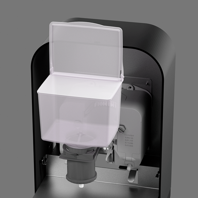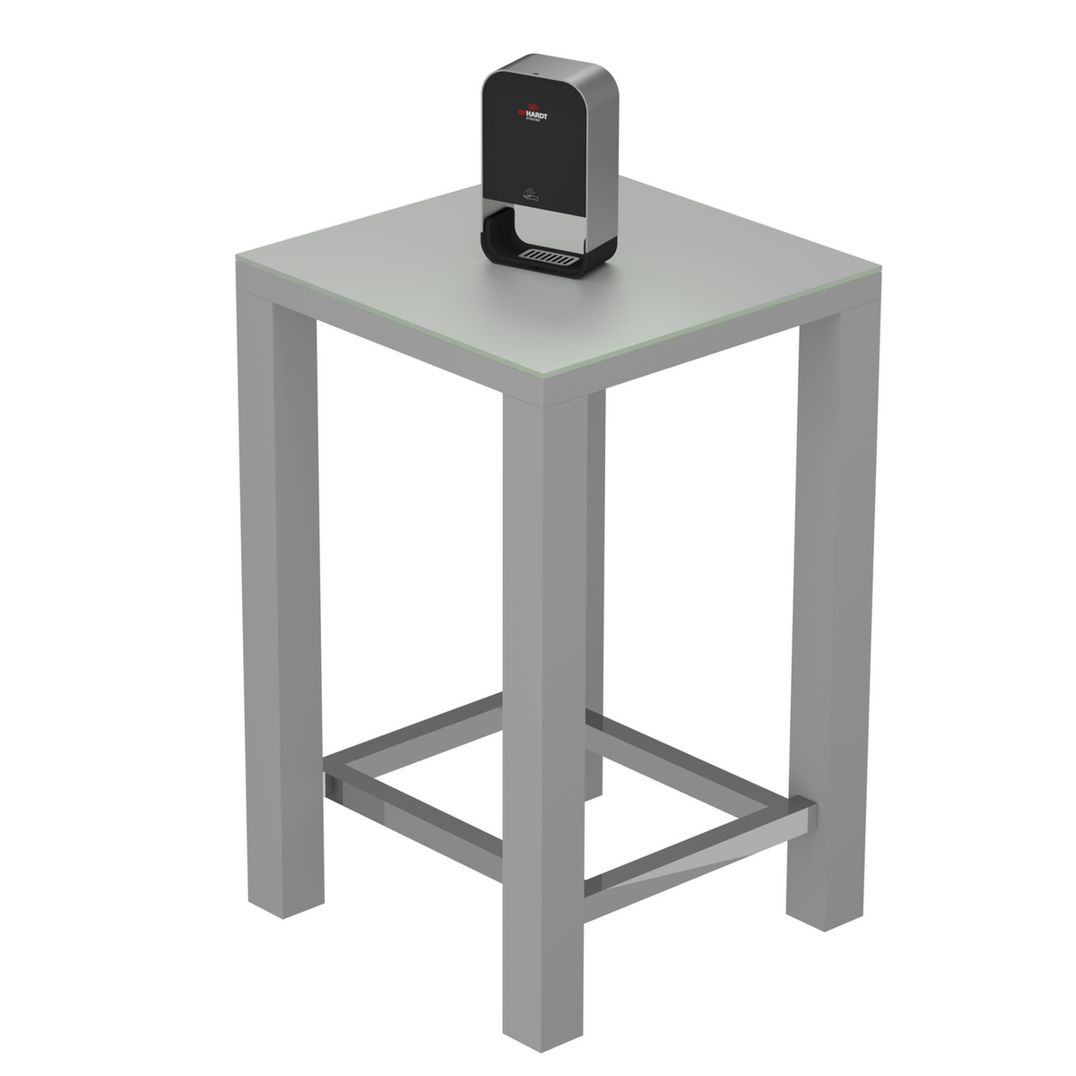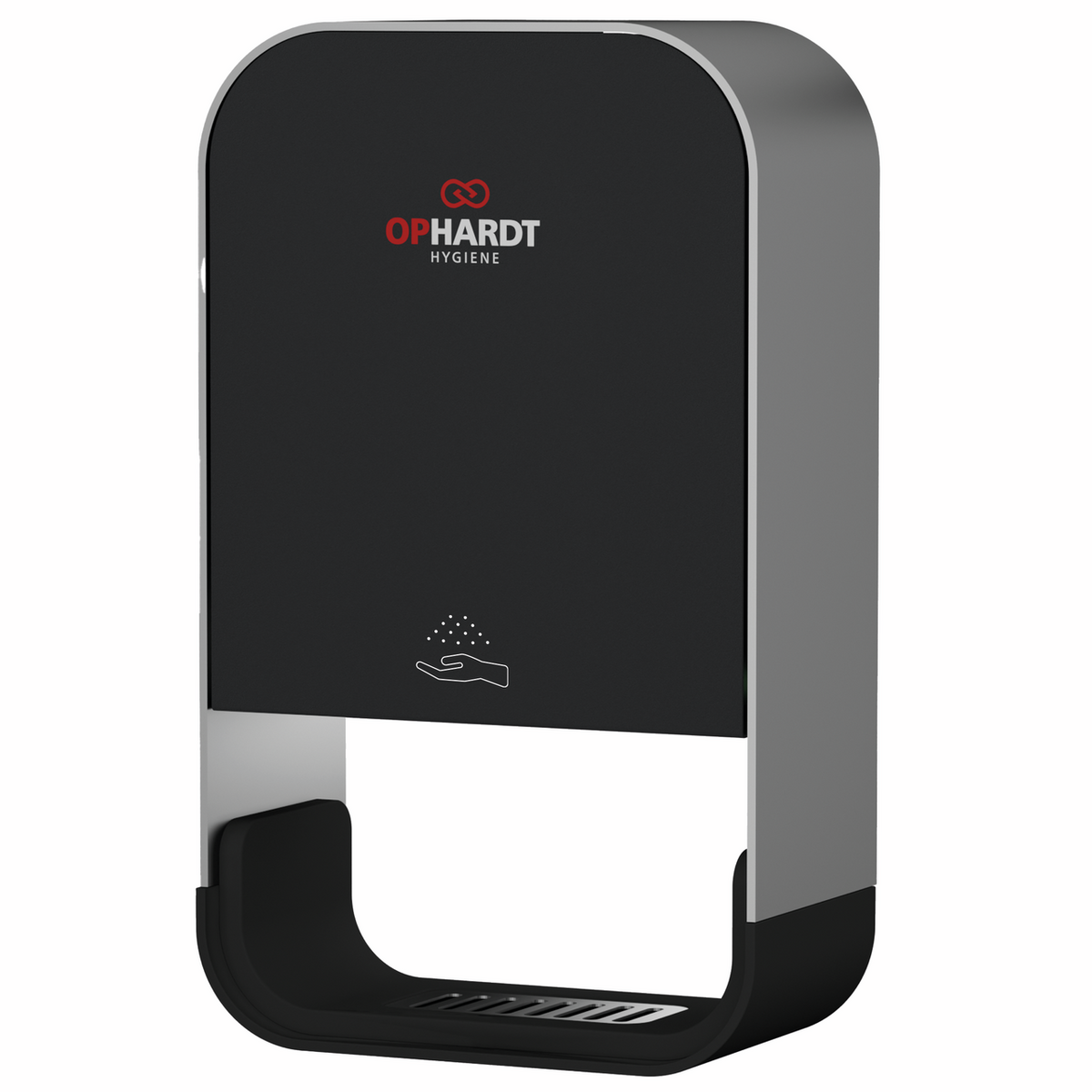 Touchless hand disinfection dispenser for alcoholic hand sanitizers, 600 ml, with X10 drive and pump for soap and disinfectants, adjustable dosage 0.4/0.8/1.2 ml/stroke, refillable container, can be operated from both sides, matte silver anodized aluminum frame, door (front) made of stainless steel, anthracite powder coated with a subtle structure, lockable, with CleanTip technology (no dripping), suitable as stand-alone unit on the table as well as with optional accessories also for mounting on a stand, with integrated drip tray, powered by 4x Alkaline D batteries