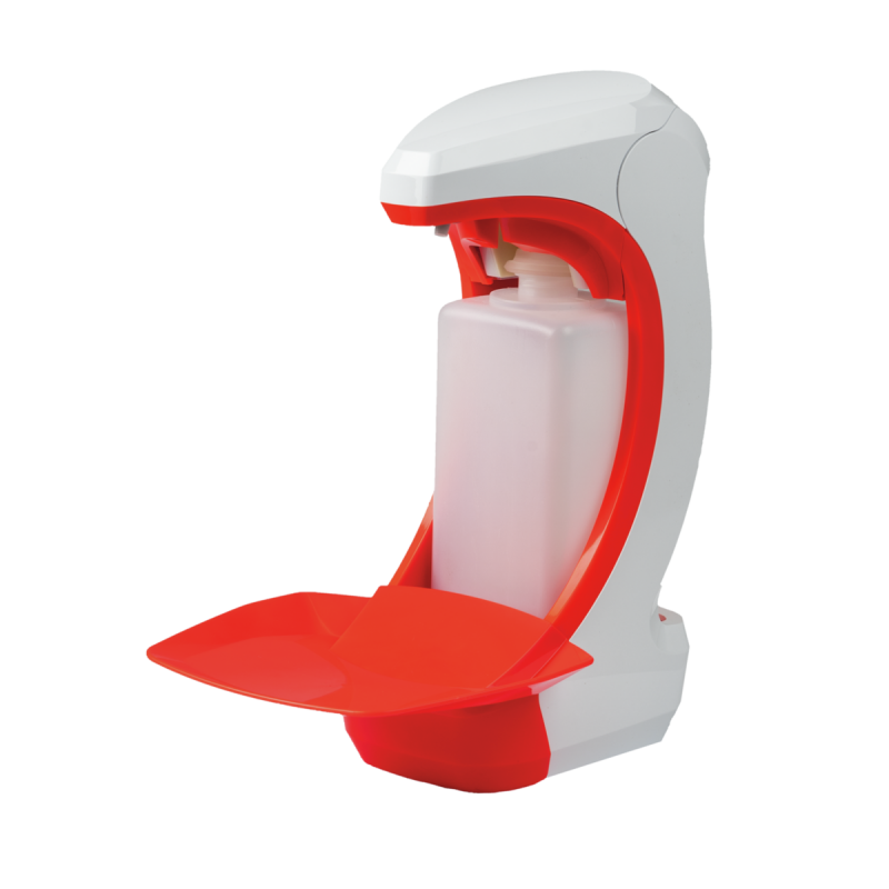 RX 5 T desktop touchless dispenser for disinfectant, alcogel, soaps and flowable lotions, for 500 ml standard Euro bottles, white plastic housing, signal red bezel, exchangeable plastic pump, dosage 1.0 ml/stroke, adjustable number of strokes (1-3 strokes), with hi-vis red drip tray, incl. empty PET Euro bottle and 4 C cell batteries