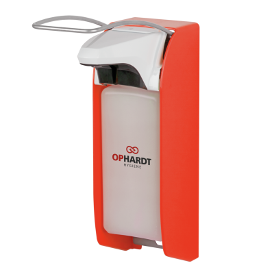 ingo-man® smart IMS TLS P/24, soap and disinfectant dispenser, for 1000 ml standard Euro bottles, long operating stainless steel lever, hi-vis red powder coated aluminium housing, exchangeable stainless steel pump 24 with bent suction tube, different dosage adjustments (approx. 0.75/ 1.0/ 1.2/ 1.5 ml/stroke), PET Euro bottle incl., with intelligent face shield that enables WiFi communication with the KANARY Software, the unit automatically records hand hygiene events (dosage, timestamp, dispenser ID) and sends that data to a central database for evaluation, gives immediate feedback on performance through an integrated LED, A separate integrated LED informs users when the battery is low