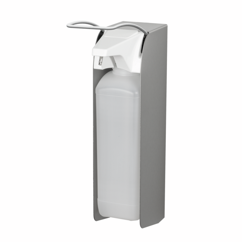 ingo-man® plus IMP XLS E/30 Steel Touch (ST), dispenser for liquid soaps without grit, alcoholic hand disinfectants and lotions, for 2500 ml standard Euro bottles, brushed stainless steel, with anti-fingerprint-coating, long operating stainless steel lever, with 30 Series stainless steel pump with bent suction tube, different dosage adjustments (approx. 1.5/ 2.0/ 2.5/ 3.0 ml/stroke), easy pump replacement through front removal, pump dishwasher-safe (60°C) and autoclavable (134°C), 1 clip, 1 HDPE bottle