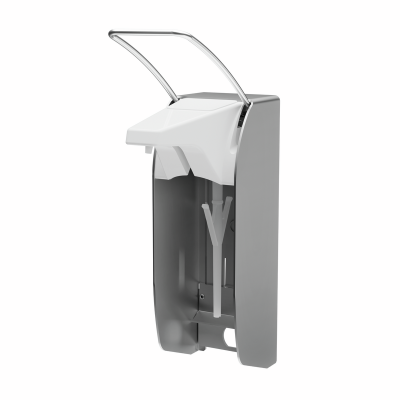 ingo-man® plus IMP E A/30, dispenser for hand cleaners with grit, for 500 ml standard Euro bottles, matte-silver anodized aluminium, short operating stainless steel lever, with 30 Series stainless steel pump with straight suction tube, different dosage adjustments (approx. 1.5/ 2.0/ 2.5/ 3.0 ml/stroke), easy pump replacement through front removal, dispenser and pump dishwasher-safe (60°C) and autoclavable (134°C), 1 clip, 1 HDPE bottle