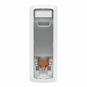 *KX Refill 450 Touchless, refillable touchless hygiene dispenser for dispensing viscous filling goods like liquid soaps and flowable lotions, for the use of a refillable 450 ml container (included in delivery) made of polypropylene, white plastic housing, white frame, with semi-permanent dispensing pump made of PCR plastic, grey, vented, with CleanTip technology (no dripping), dispensing quantity 2.0 ml/stroke, incl. refill container, 4 alkaline D batteries and mounting kit for wall mounting
